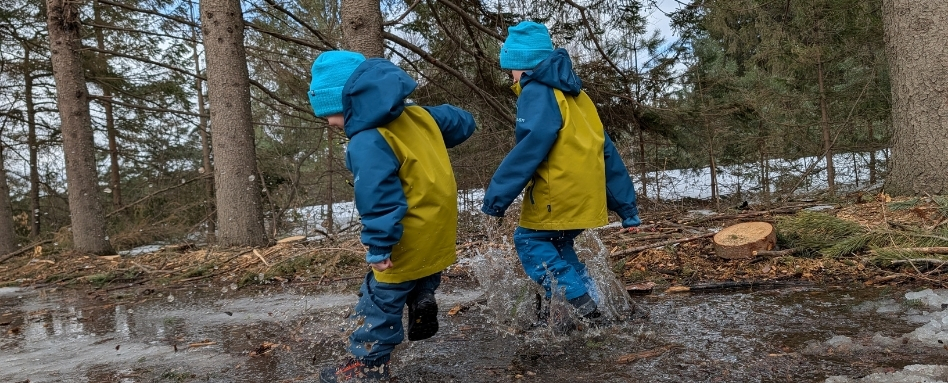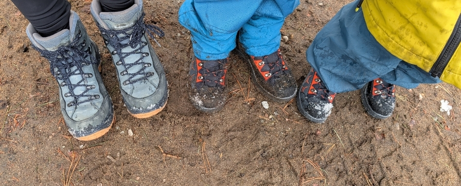 With wet snow and mud on the ground, it doesn’t take long for feet to get wet. Hence the importance of waterproof rain boots for fun, or water-resistant hiking boots for outings on the trail. I don’t recommend rain boots for hiking, because they don’t provide good support for the feet and ankles. I also recommend avoiding cotton socks, as they dry very slowly and retain moisture. As with a base layer, merino wool or a synthetic fibre is ideal.